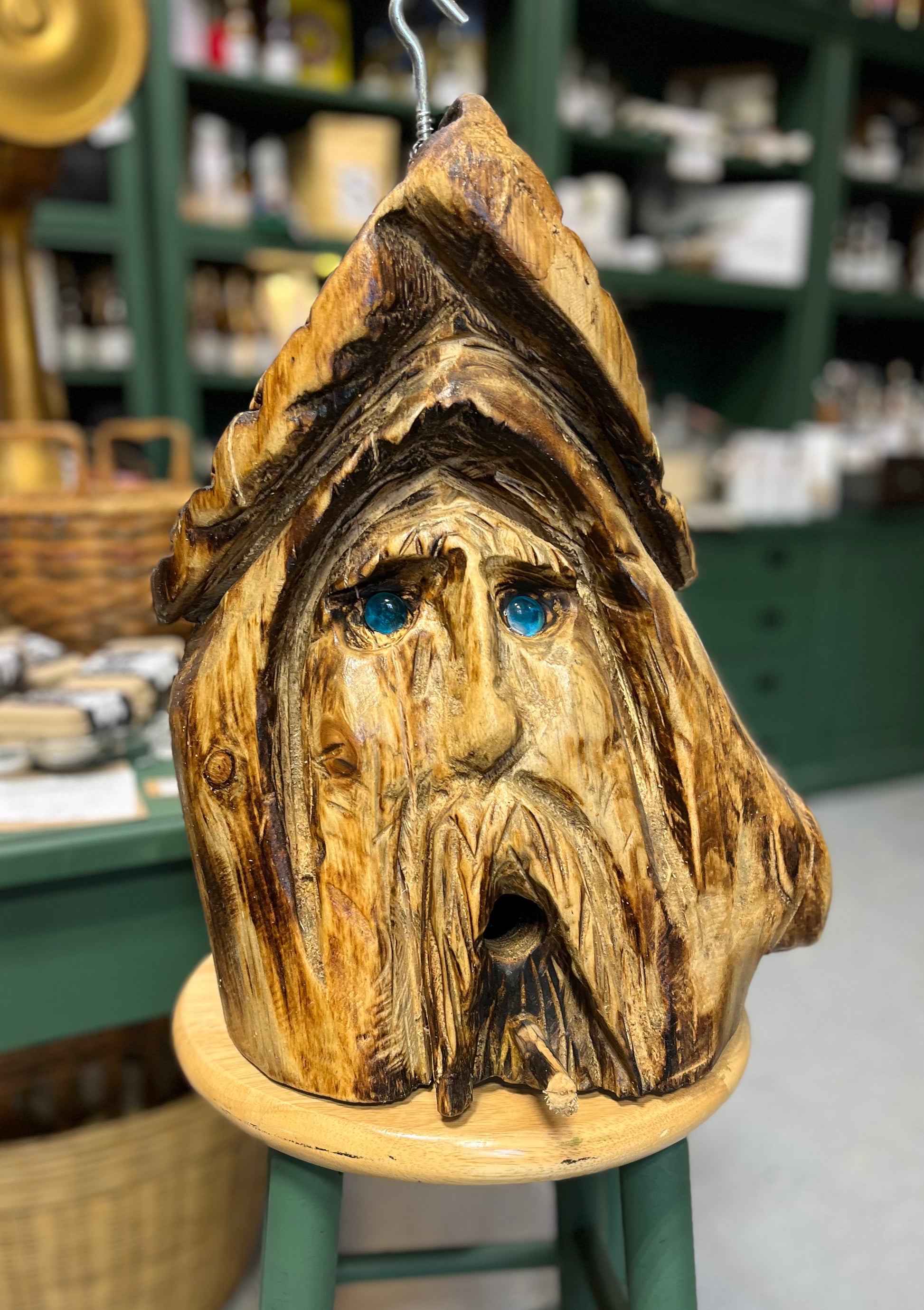 A whimsical and charming abode for your feathered friends! With every intricate detail meticulously crafted by skilled artisans, this unique bird house showcases the artistry and craftsmanship of hand carving. Inspired by the magic of winter, the enchanting design features the endearing face of Old Man Winter himself, bringing a touch of whimsy to your outdoor space. Made from durable and weather-resistant materials, this bird house ensures long-lasting enjoyment for both you and your avian visitors. Hang it in your garden or on your patio, and watch as birds flock to find warmth and shelter in this cozy and artfully crafted winter retreat.