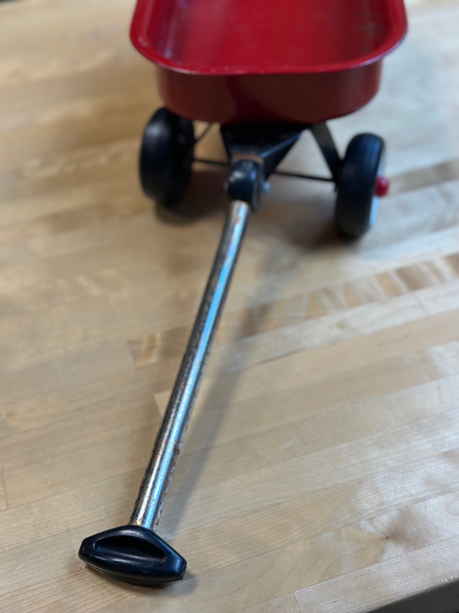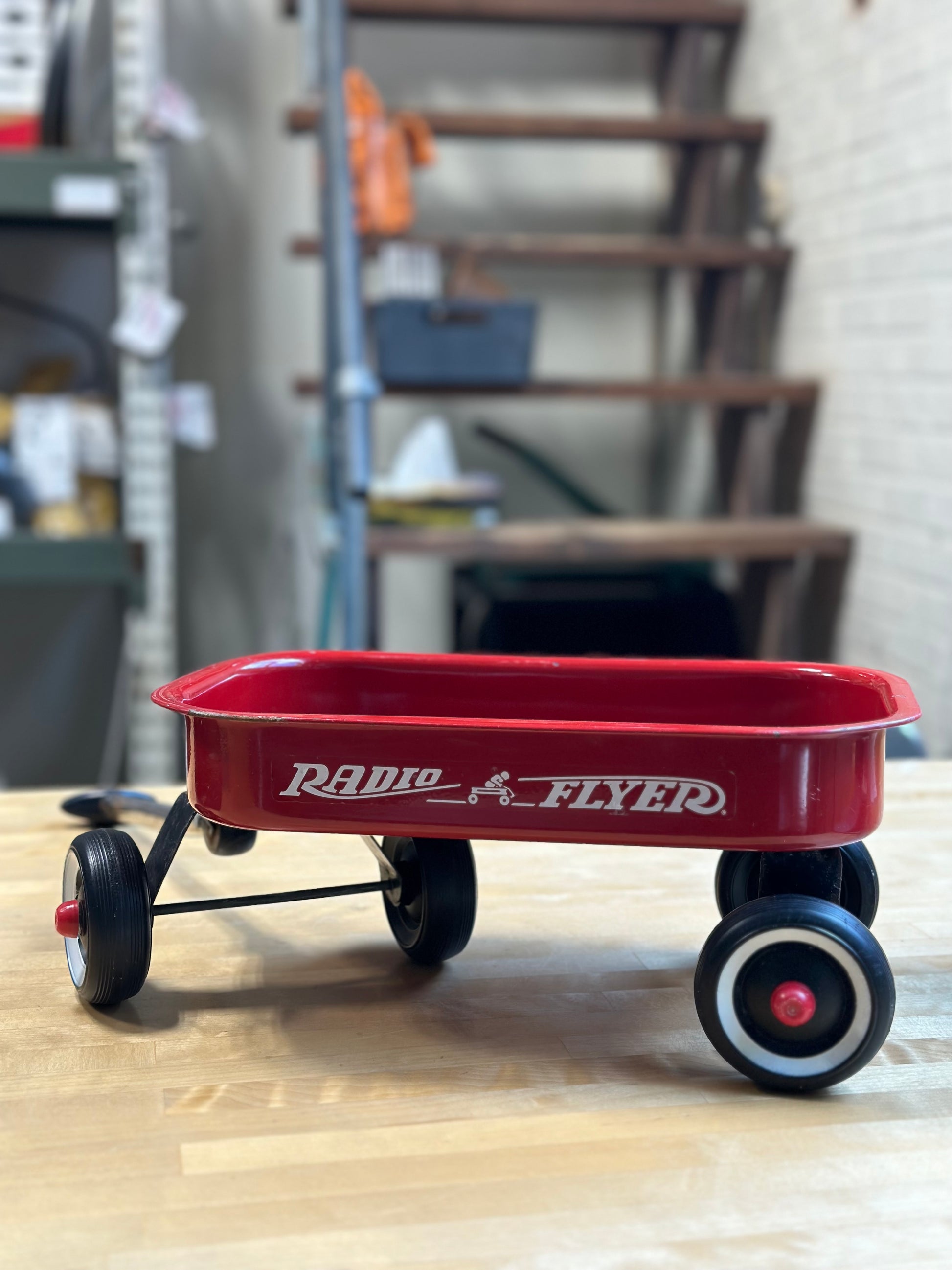 This wagon features a sturdy, all-steel construction, an iconic red finish, and a seamless metal bed that highlights its durability. As a vintage collectible, this wagon is a perfect addition to any toy or wagon collection, transporting you to an era of simple childhood play.
