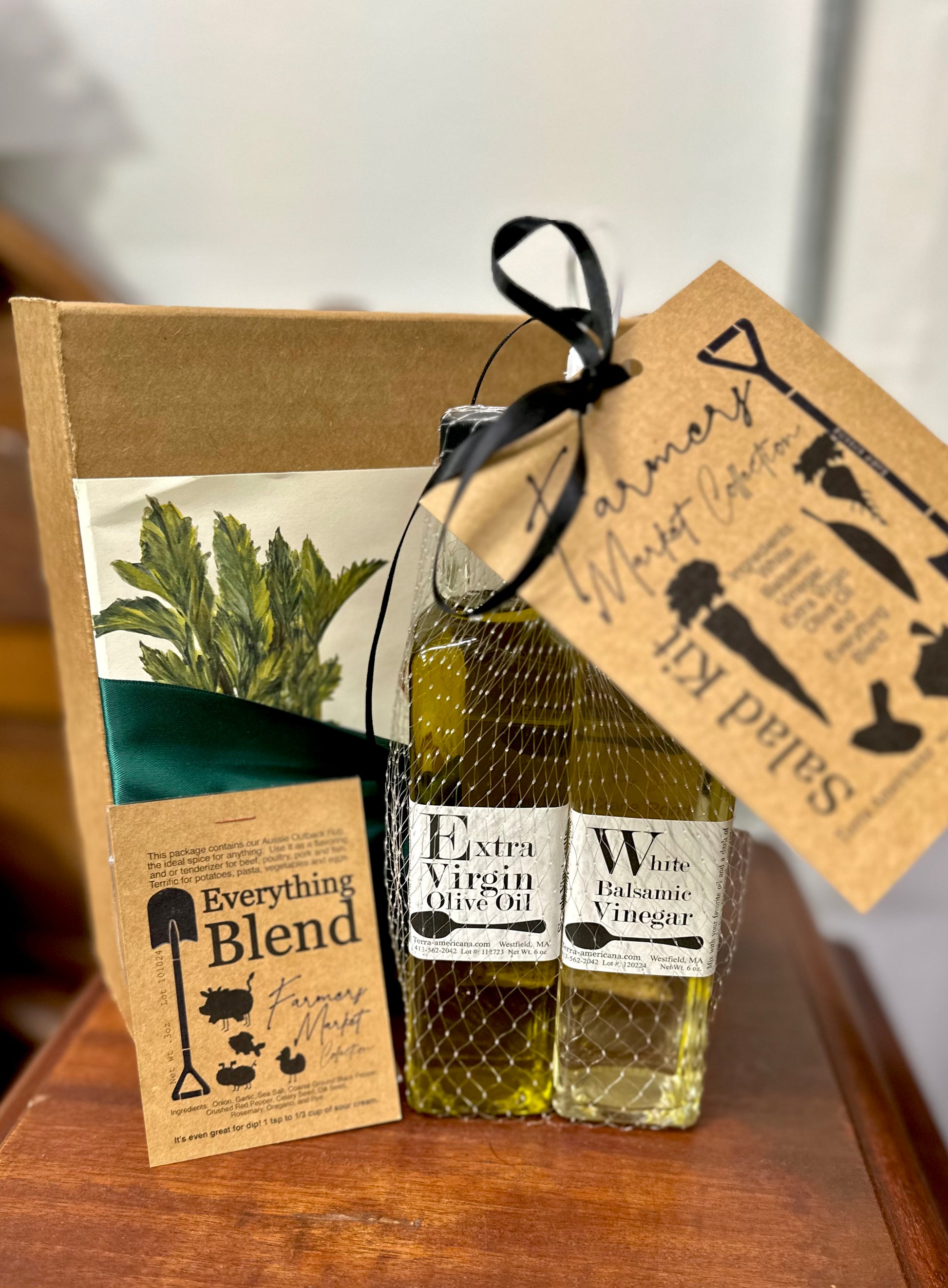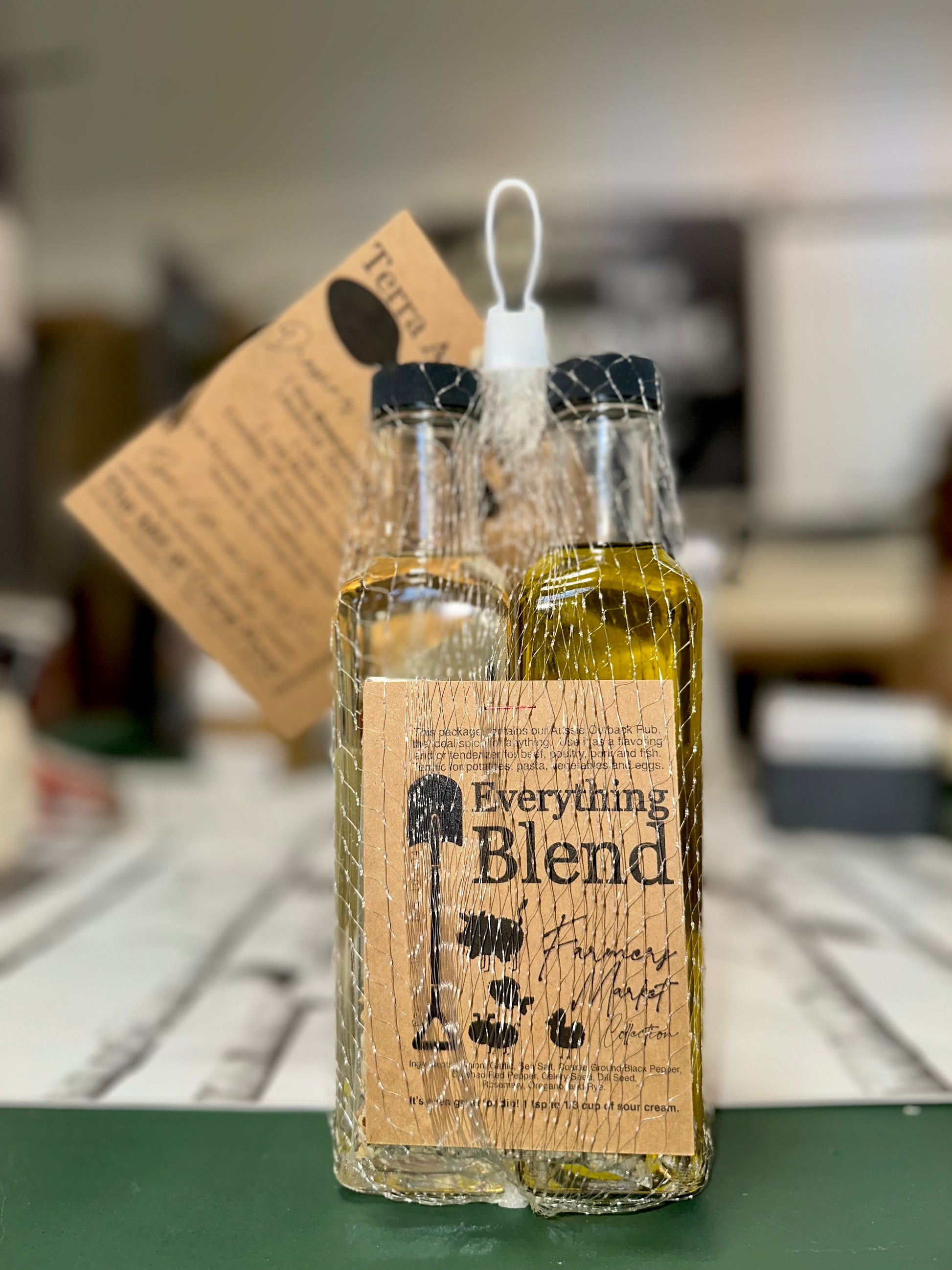 Extra Virgin Olive Oil, White Balsamic Vinegar and our Everything Blend.