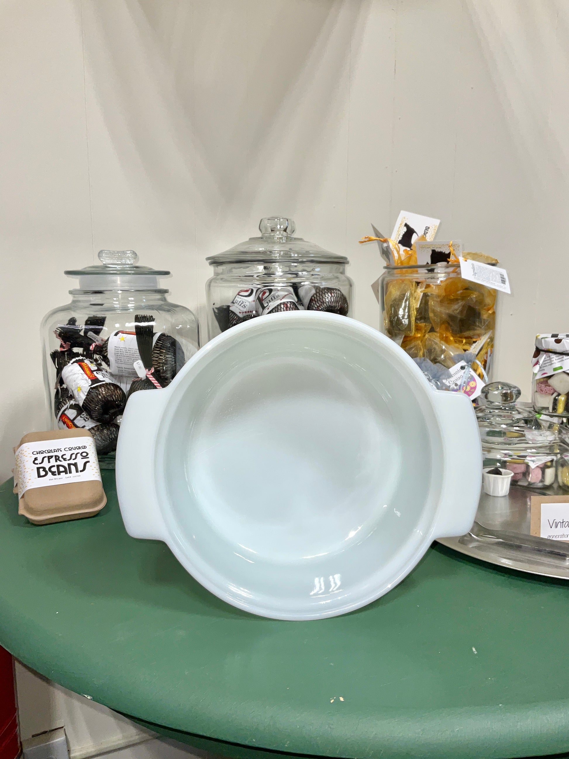 Classic white milk glass casserole dish from Fire King with double side handles. This is perfect to use from cooking to serving at a table. The 50's milk glass is rare, beautiful and in good condition. Without a lid.