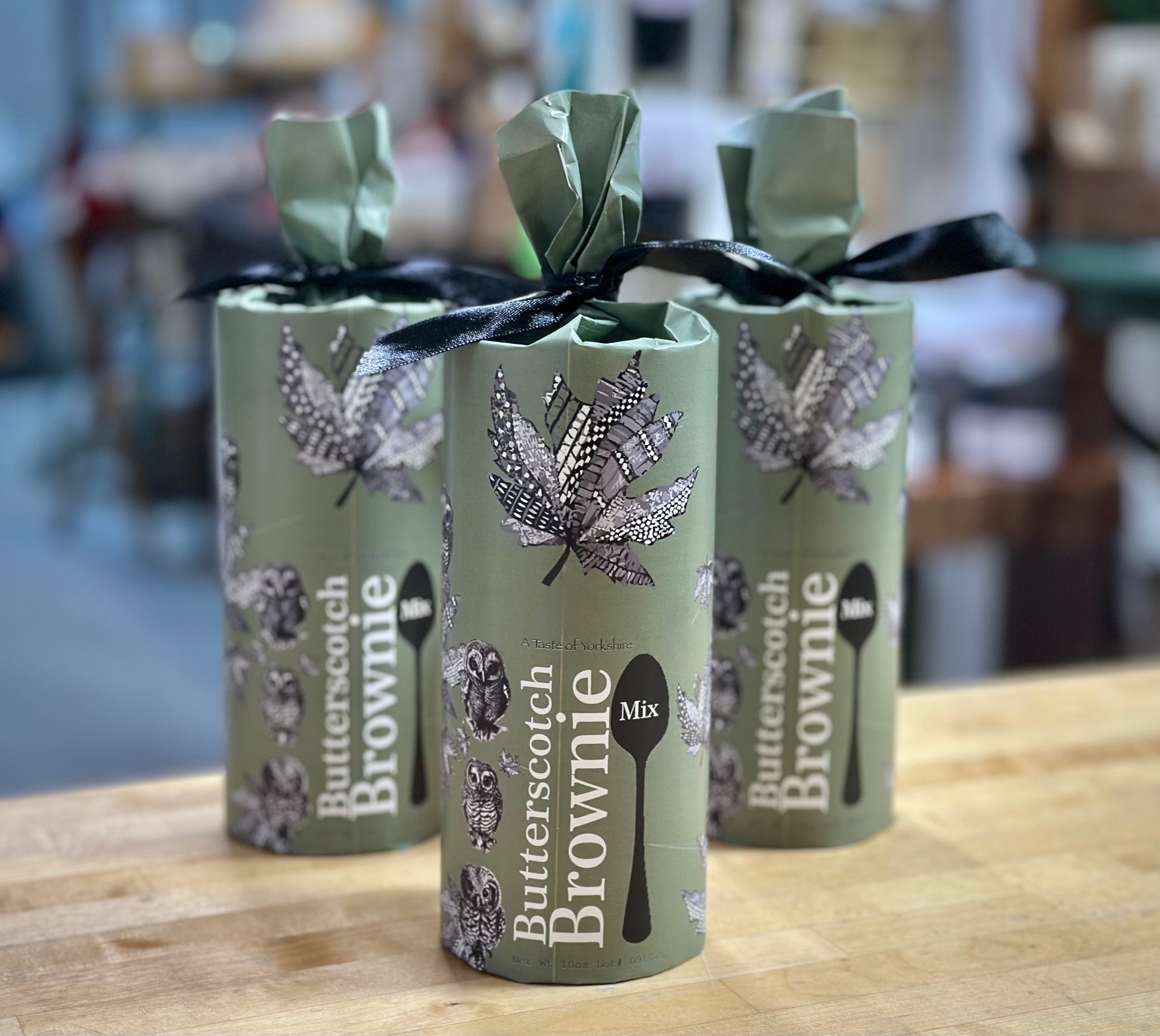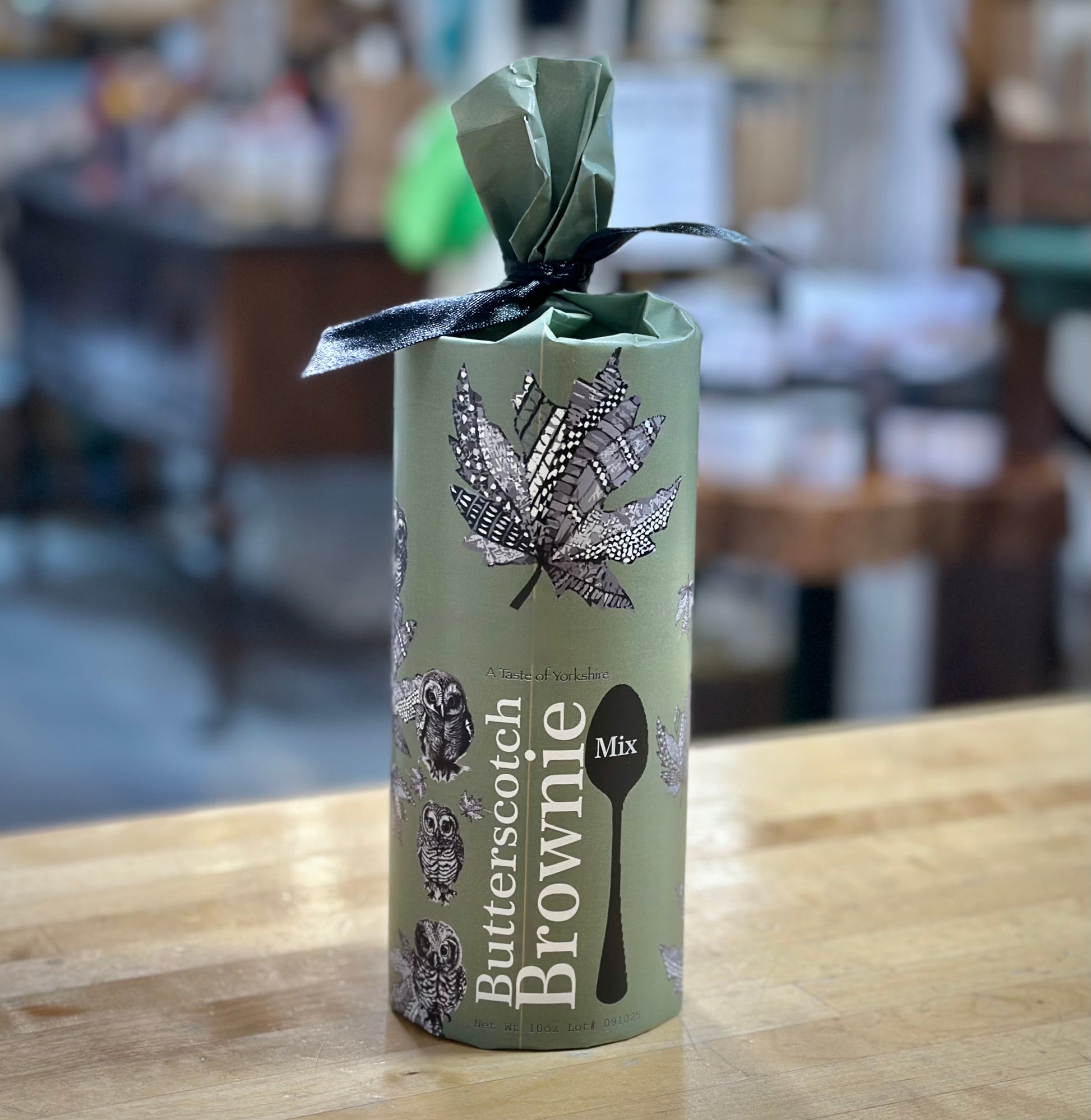 BUTTERSCOTCH BROWNIE MIX - Wrapped Tube Ingredients: Wheat Flour enriched (Niacin, reduced iron, thiamine, mononitrate, riboflavin, folic acid), Malted Barley Flour, Fair Trade Majestic Duch Cocoa Powder, Baking Powder, Orange Vanilla Sugar (special pure orange extract [alcohol, water, and orange oil], and Vanilla Extract [vanilla, water, propylene glycol, and caramel color]) and Kosher salt. Butterscotch chips (sugar, nonfat milk powder, partially hydrogenated palm kernel oil, soy lecithin added as an emulsifier, monoglycerides, artificial color, titanium dioxide, and artificial flavor).