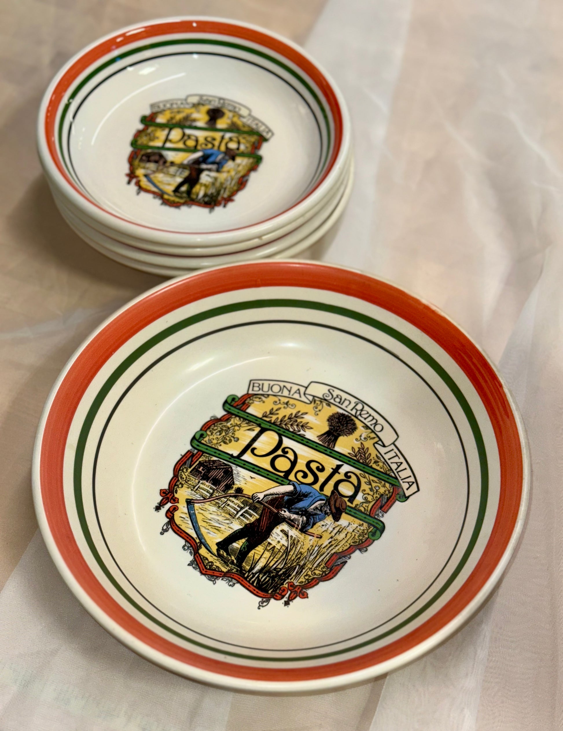 This colorful 5-piece ceramic set includes one large serving bowl and four matching individual pasta bowls, each decorated with vibrant red, green, and white borders and a classic Italian countryside Pasta motif in the center.