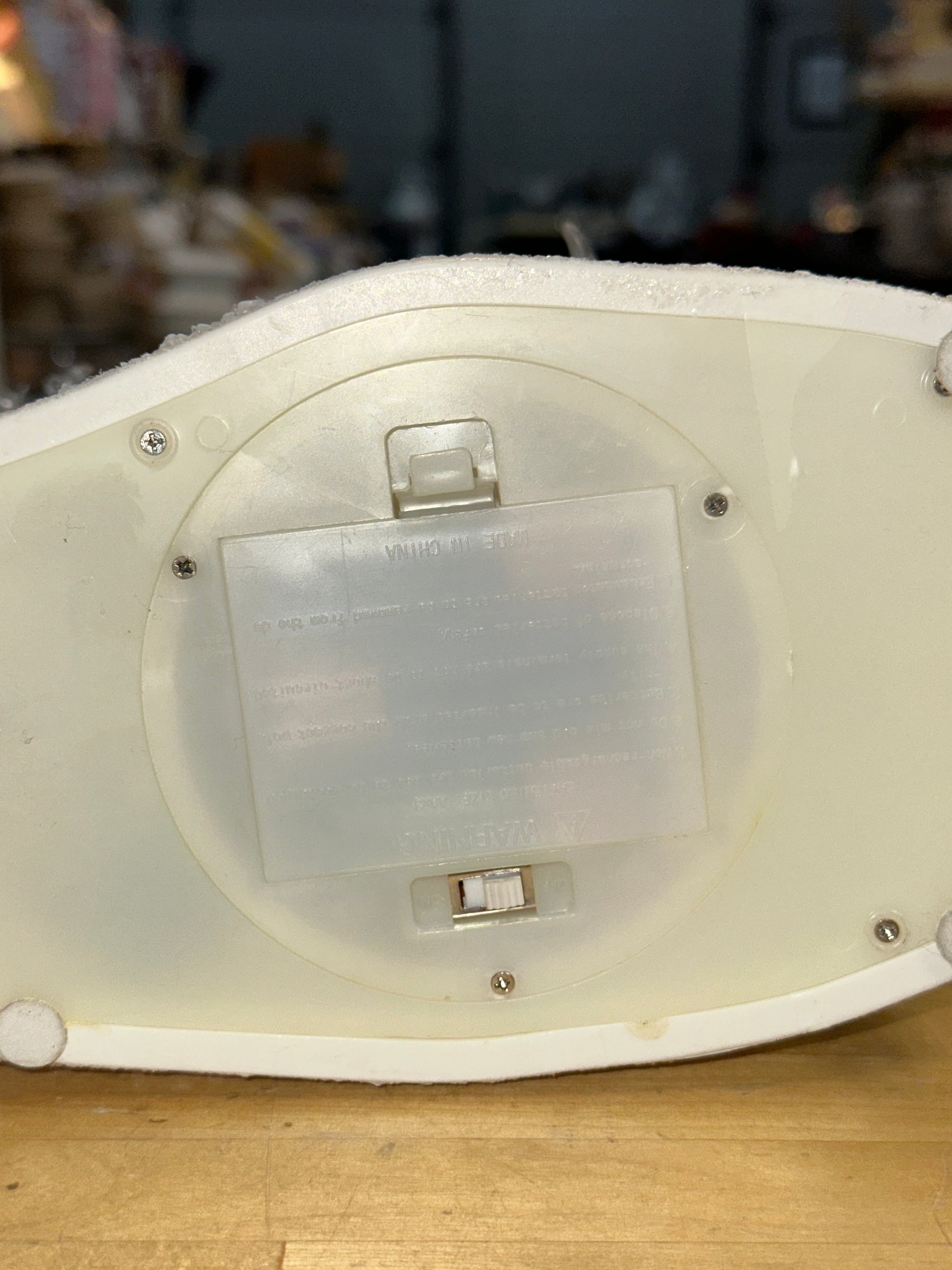 The figurine includes a built-in battery compartment that powers soft LED lighting, adding a warm, magical touch to the snowy base and winter details. Accented with miniature evergreen trees and decorative elements, this piece is perfect for mantels, shelves, tabletops, or Christmas centerpieces.