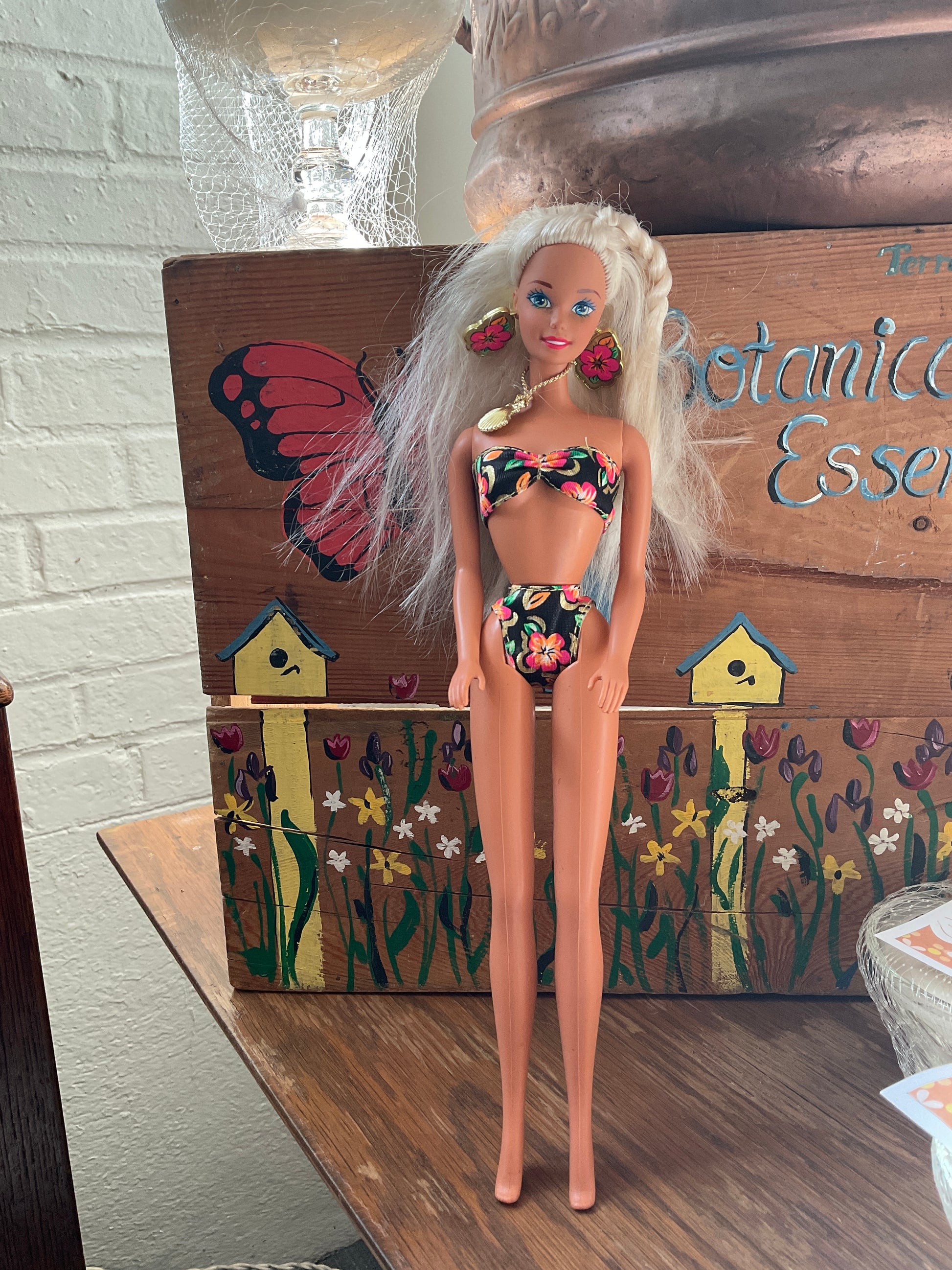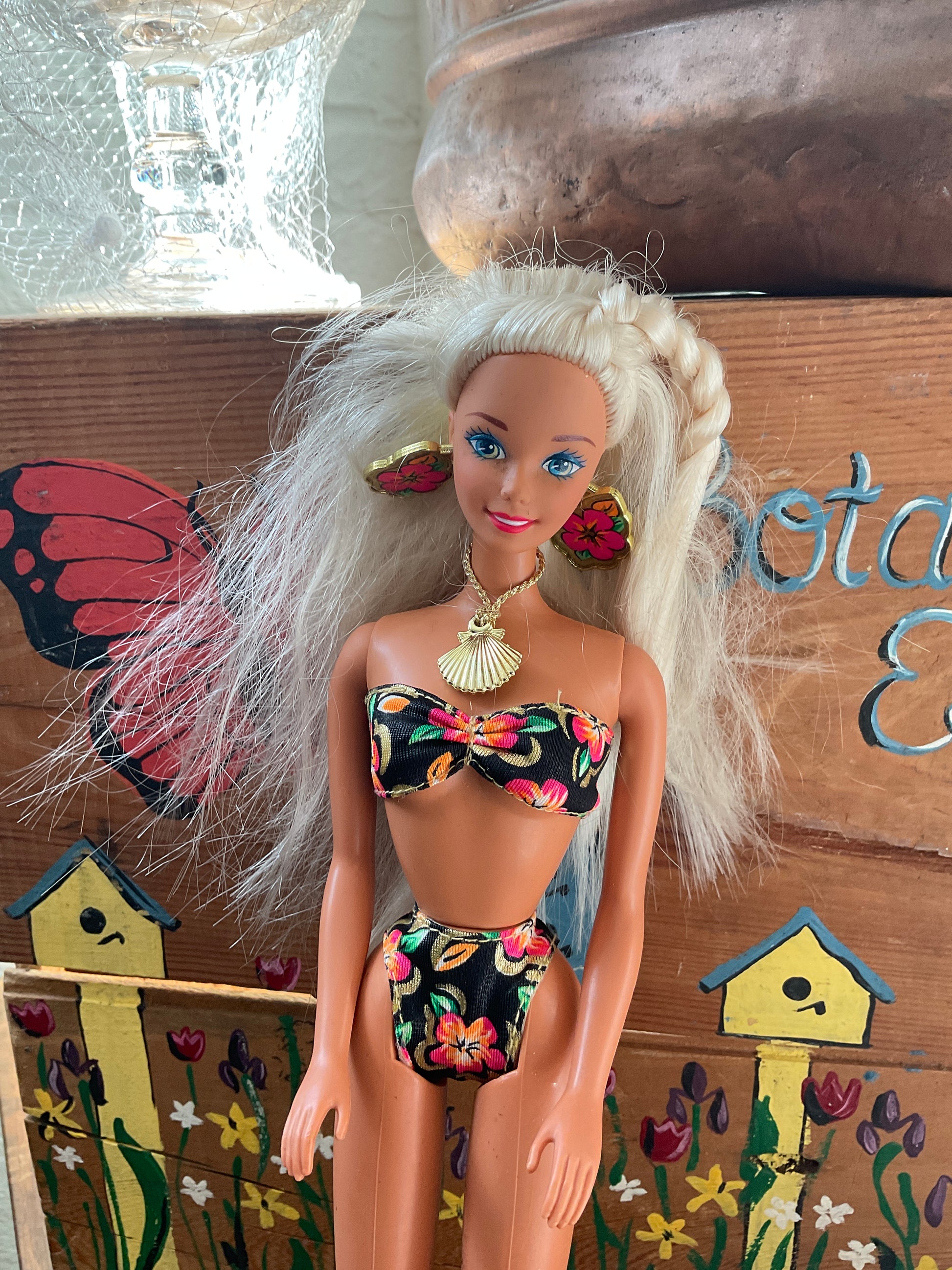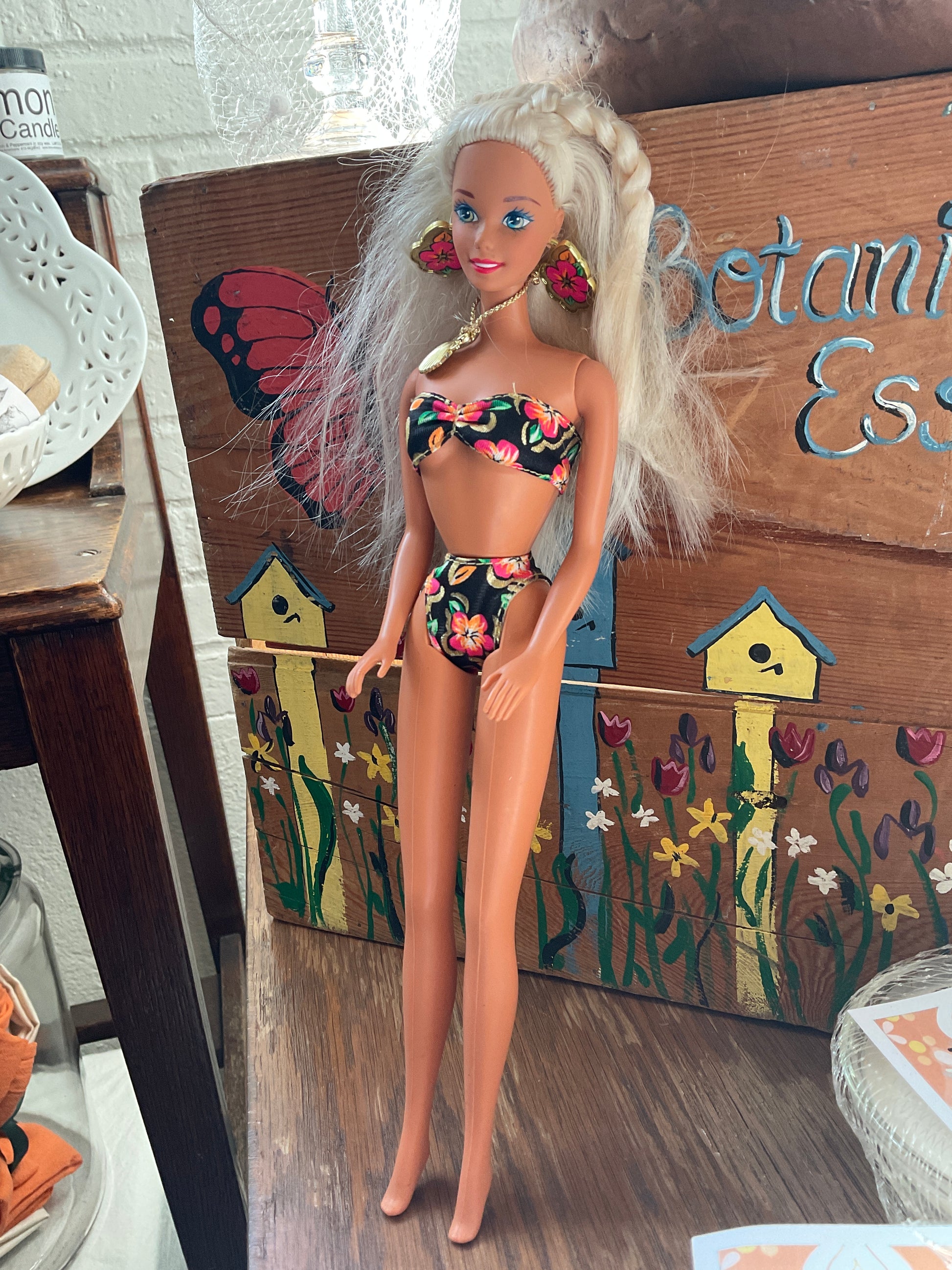 Vintage Straight Haired Barbie Mattel 1966. Bendable knees. Wearing adorable flower pattern swimsuit. She also has fancy earrings and necklace. Blue eyes and long blonde hair.
