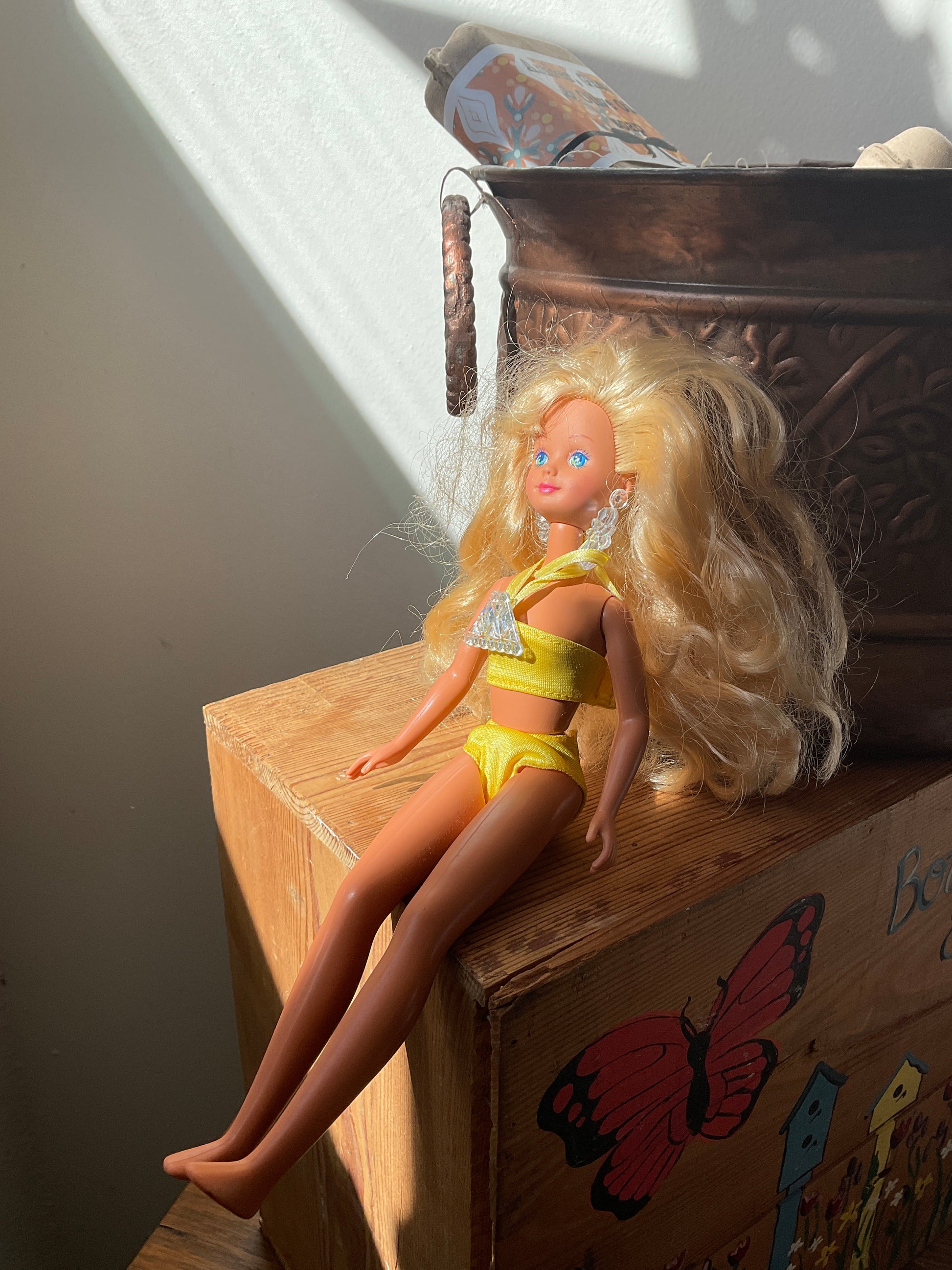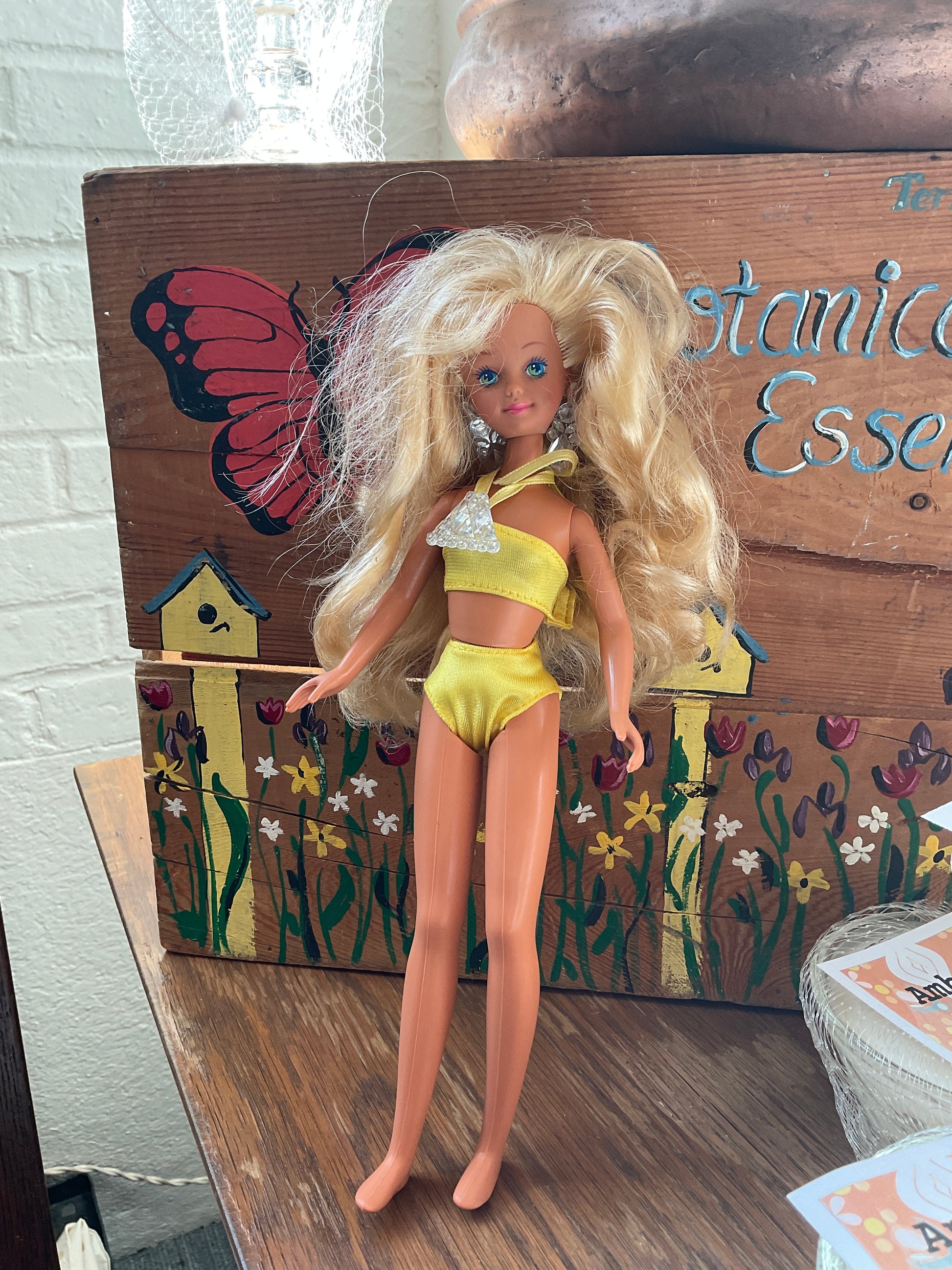 Vintage Curly Haired Barbie Mattel 1966. Bendable knees. Wearing yellow jeweled swimsuit. She has blue eyes and blonde hair with the bang.