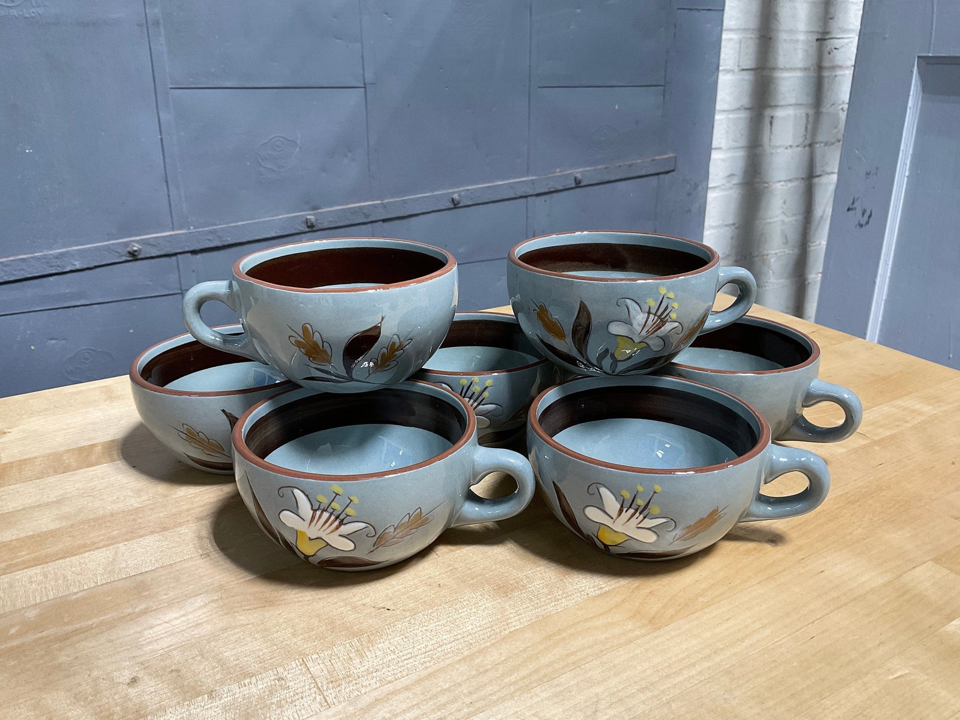 TEACUPS Set of 7 in excellent condition. 1 cup does not have a clear artist's mark but is believed to be original to this set. Each cup is 3 3/4" in diameter and 2" tall.