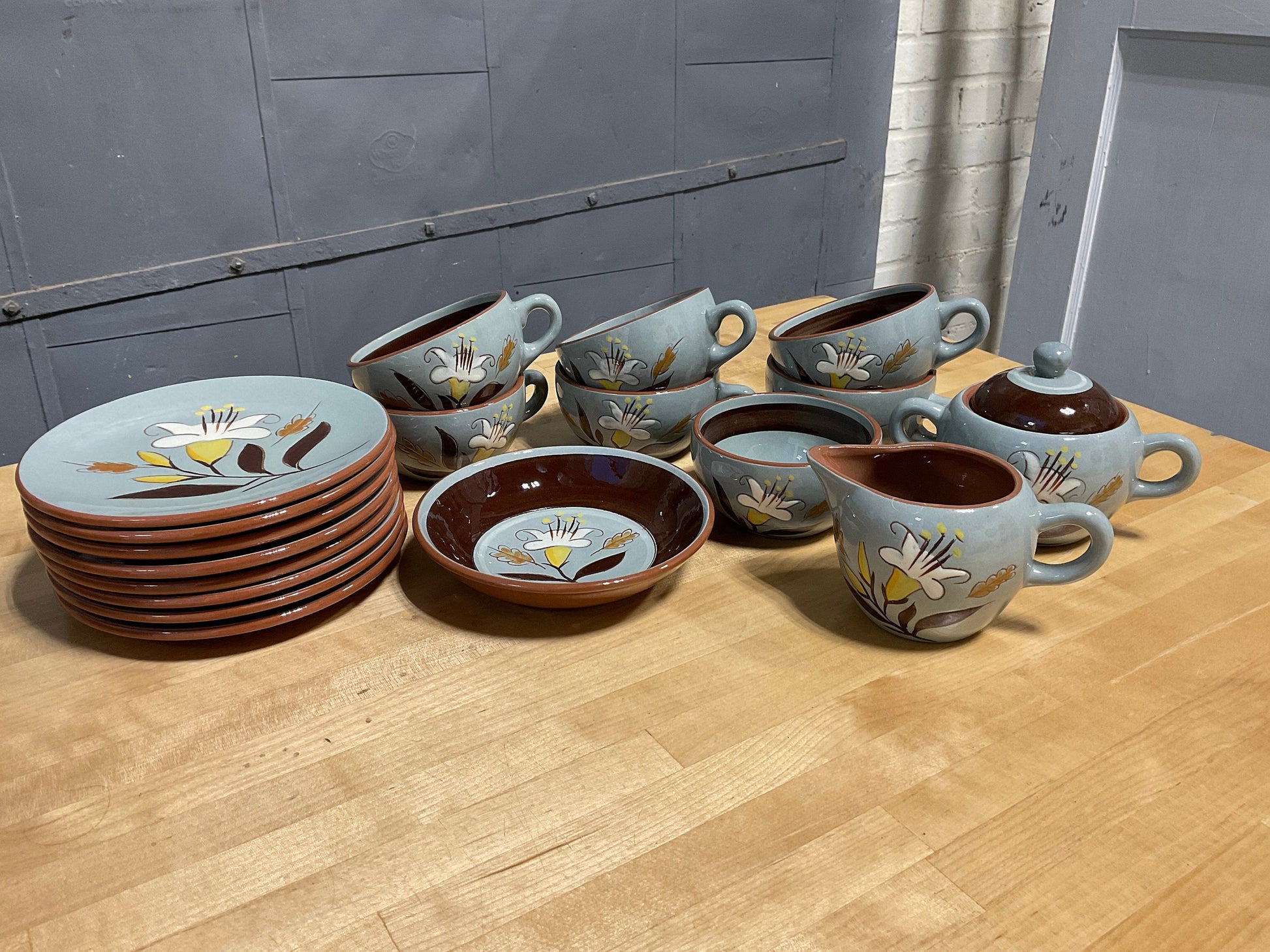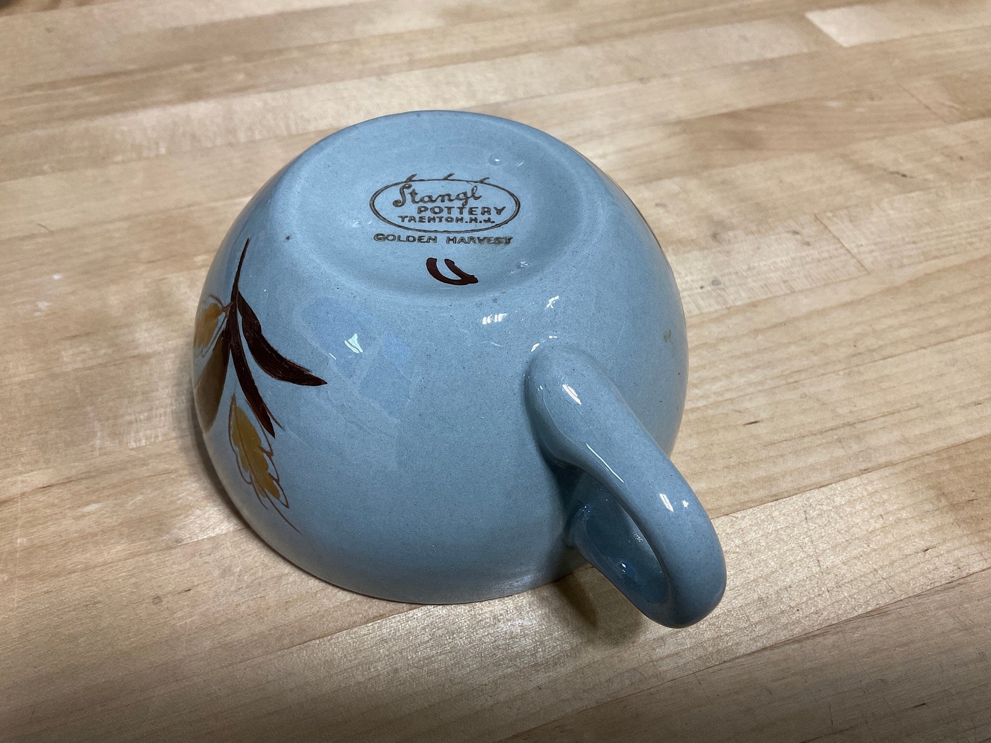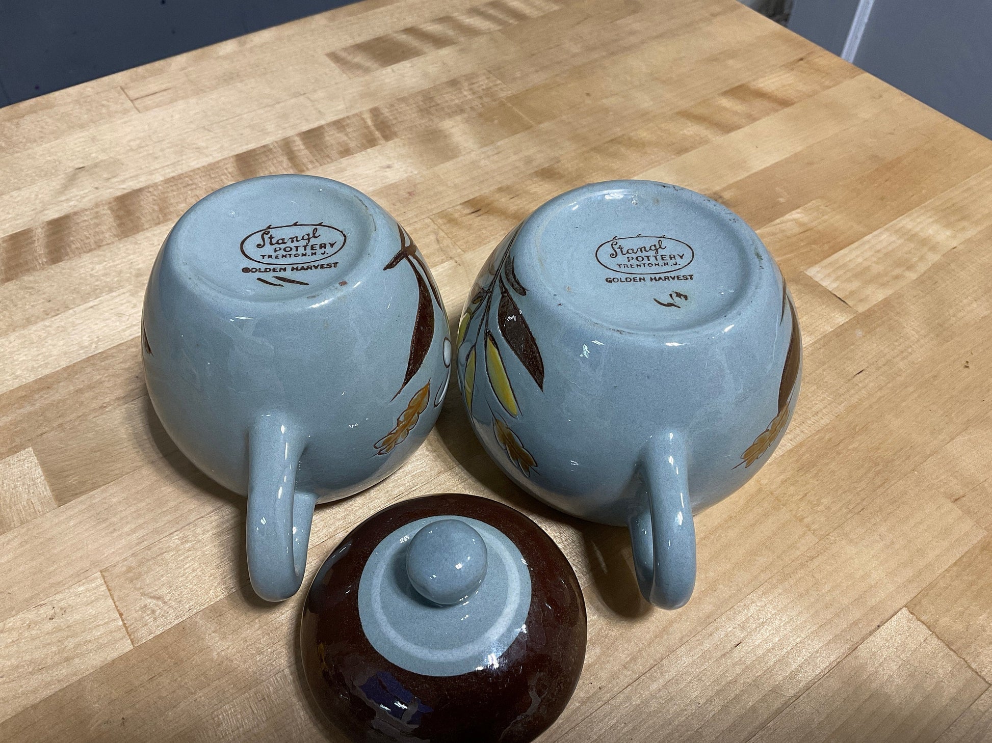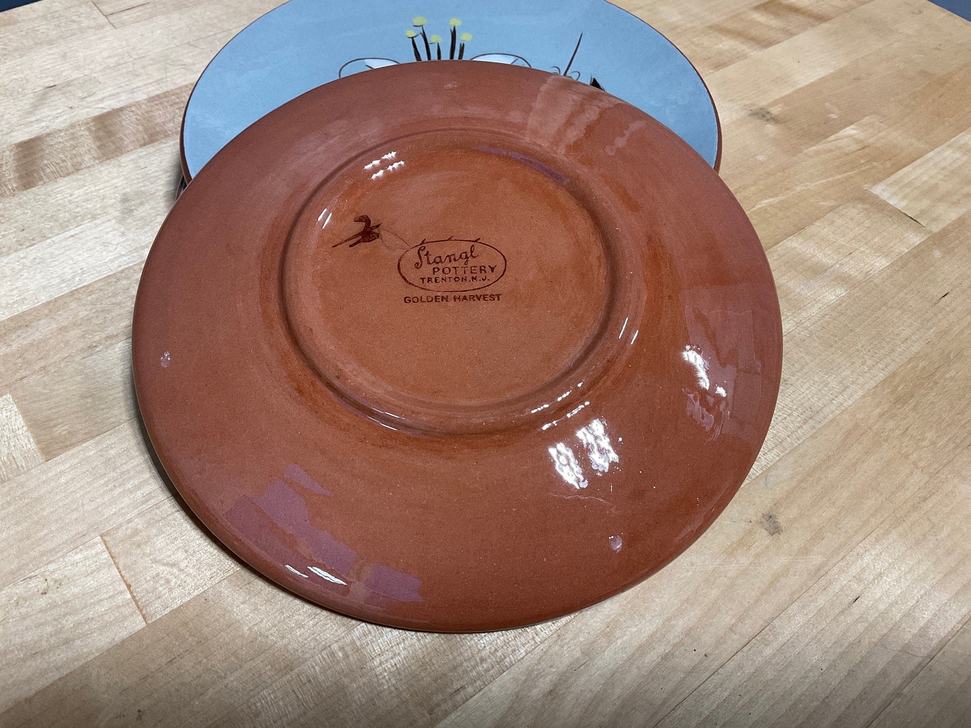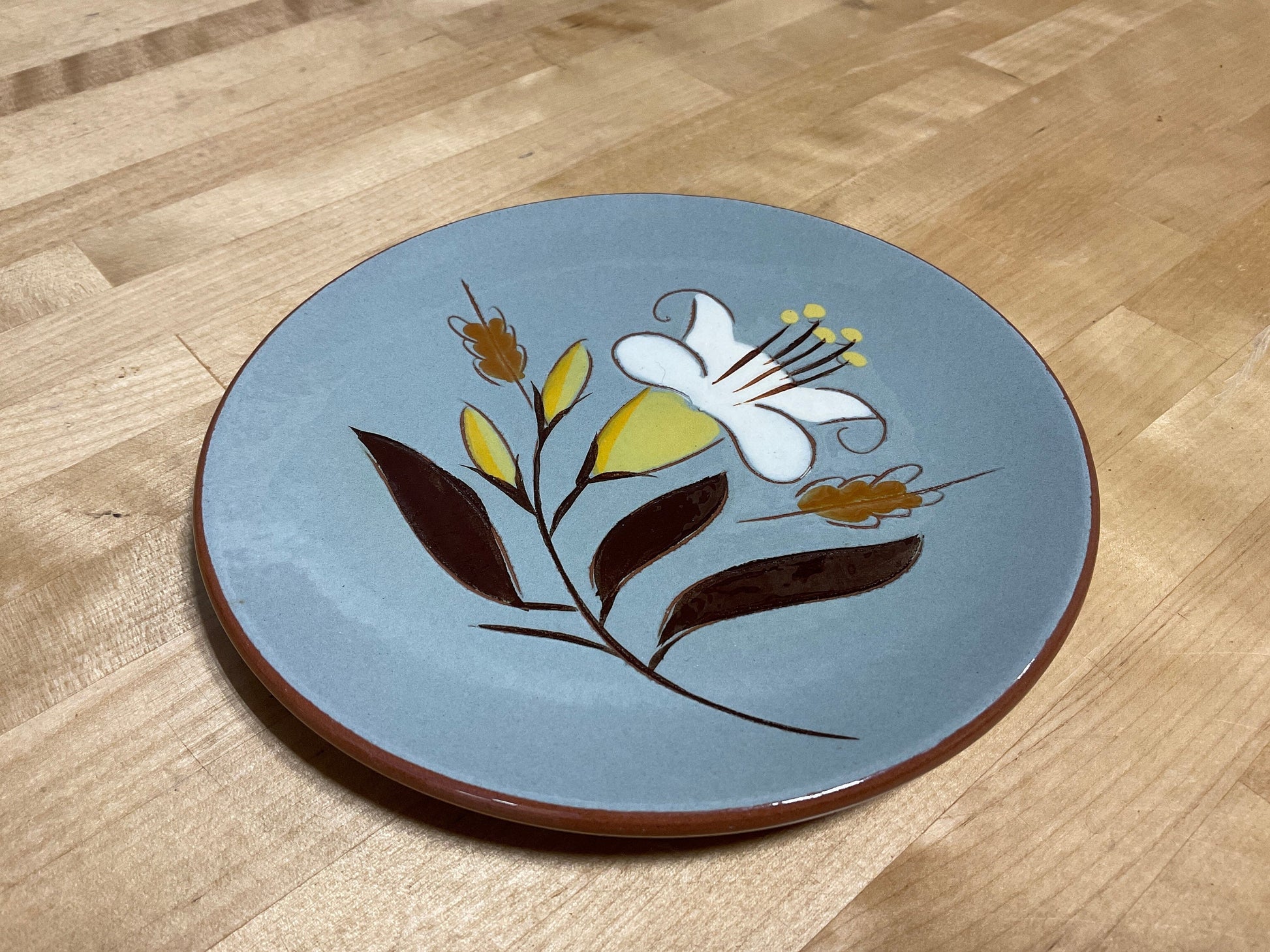 The Golden Harvest pattern was made from 1953-1978. It features a white and yellow lily on a blue-grey background with dark brown accents. Each item is marked "Stangl Pottery, Trenton, N.J." and "GOLDEN HARVEST." All but one piece has a clear artist/painter's mark, and some are also marked with a clear carver's mark. All items have a high-gloss finish. More photos are available upon request.