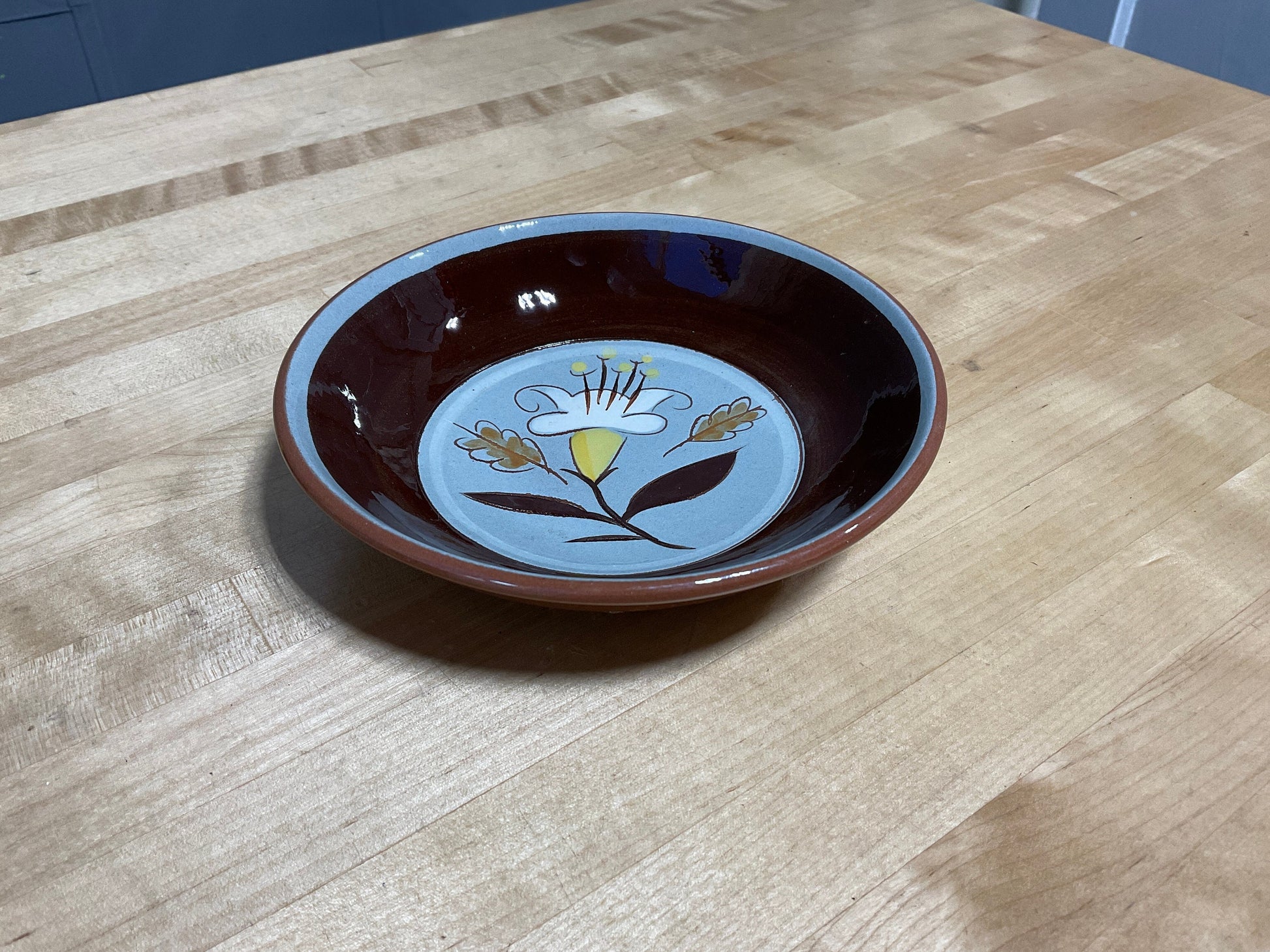 SMALL SAUCE/DESSERT BOWL This small, shallow bowl would make an excellent dish for sauce, oil, olives, or any small item you wish to serve. Features a wide brown band surrounding the lily design and a terra cotta-colored back. Measures 5 1/2"W x 1 1/4"H.