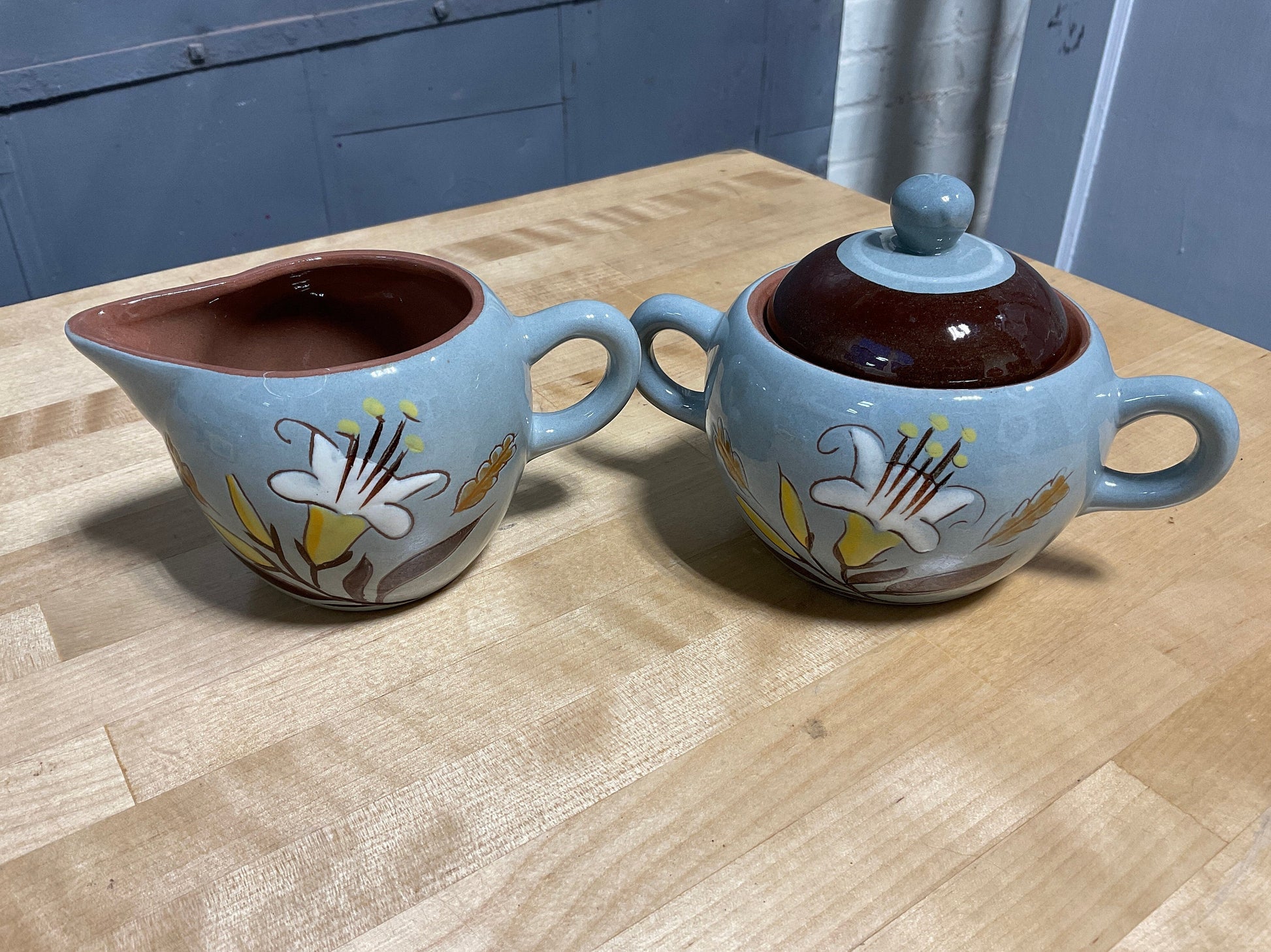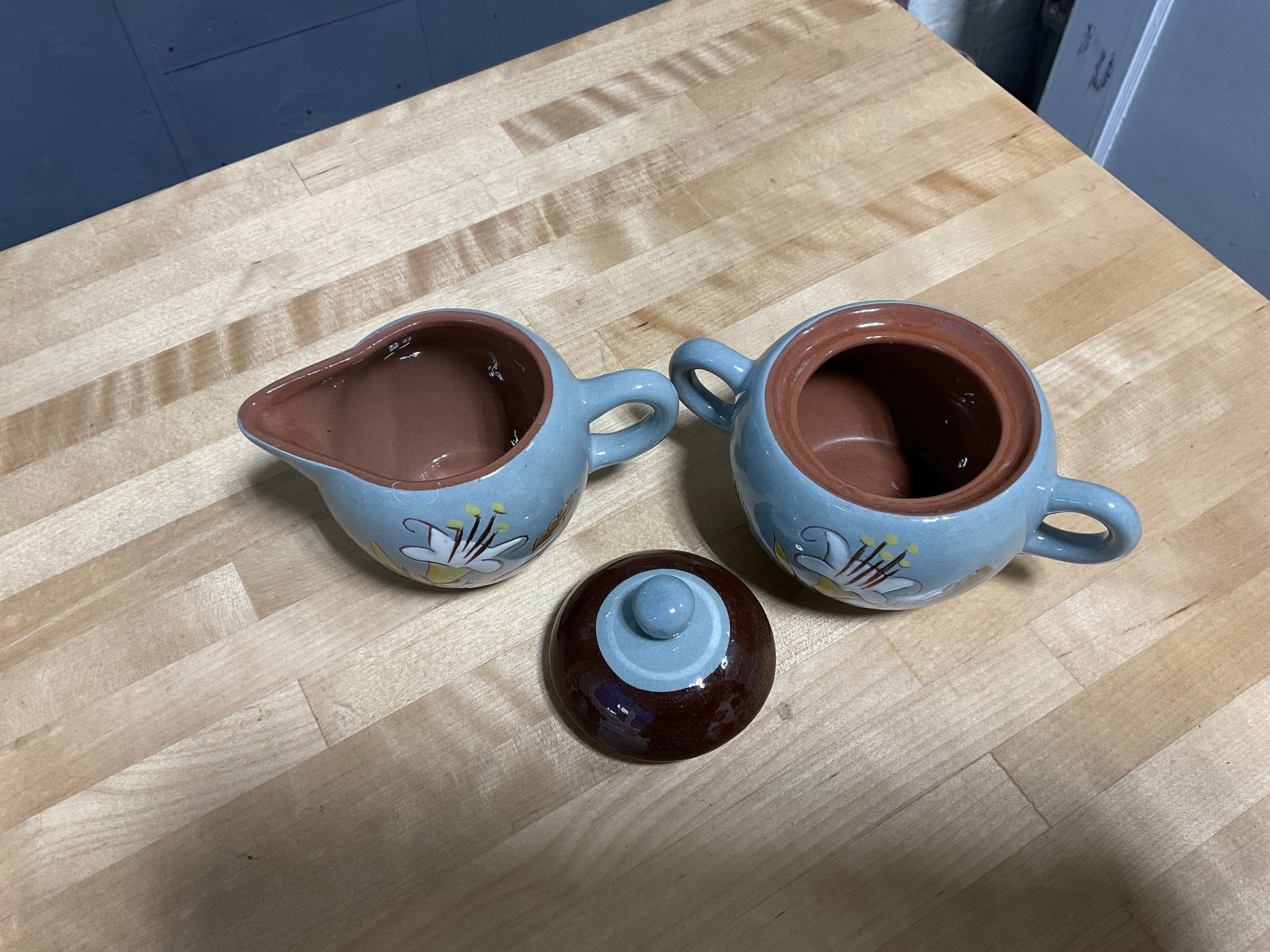 CREAMER & SUGAR BOWL SET This adorable set is the perfect complement to the teacups, or use it to serve a sauce/dressing and dry seasoning, such as coarse salt. The Interior of both pieces is terra cotta colored. The sugar bowl features two handles and a fitted lid.