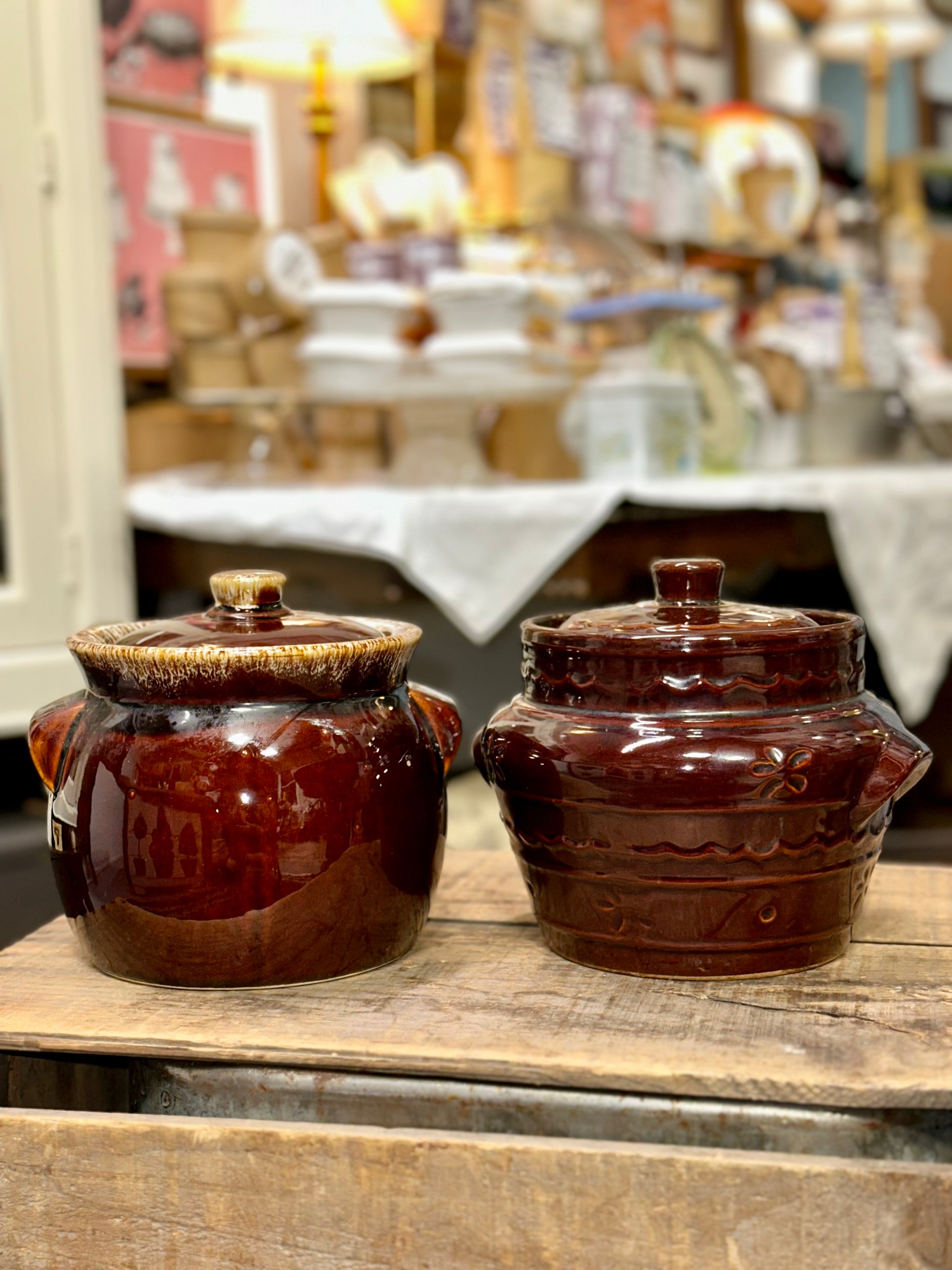 Bring warm, old-fashioned charm to your kitchen with this pair of vintage brown stoneware crocks, each featuring a rich antique-style glaze and sturdy lidded design. These classic crocks are perfect for rustic, farmhouse, country, or cabin décor, and can be used for storage, display, or as functional kitchen pieces.