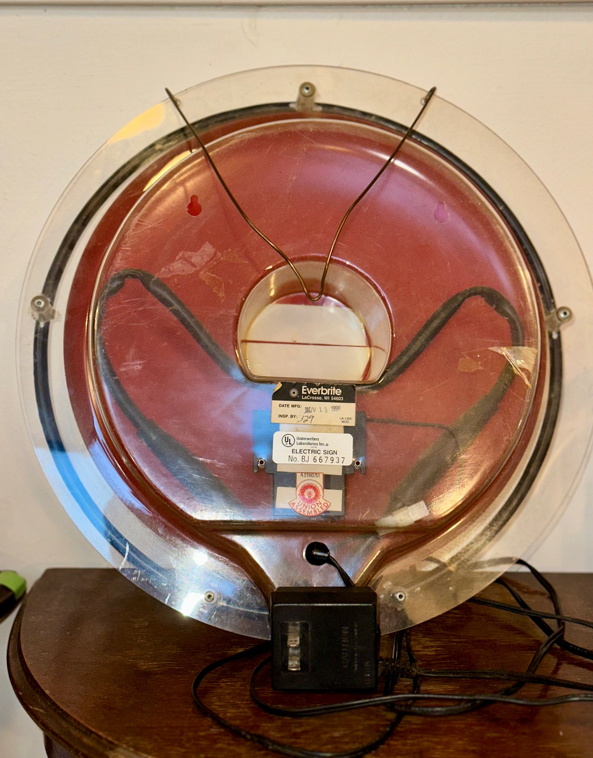 Bring true retro charm to your space with this authentic 1990 Coca-Cola illuminated wall sign. Featuring the iconic red “Coca-Cola” button design with a vintage glass Coke bottle at the center, this collectible piece includes a glowing circular neon tube that lights up beautifully when plugged in.