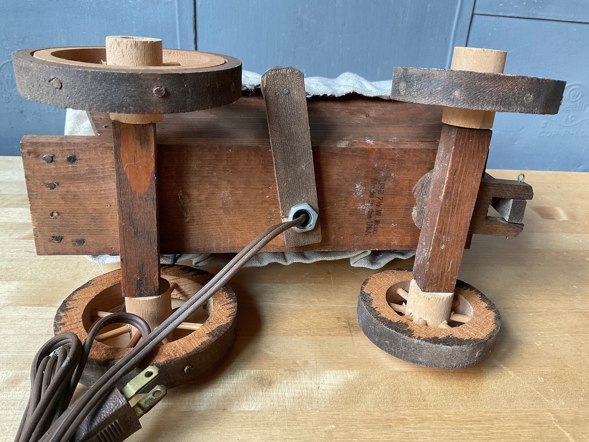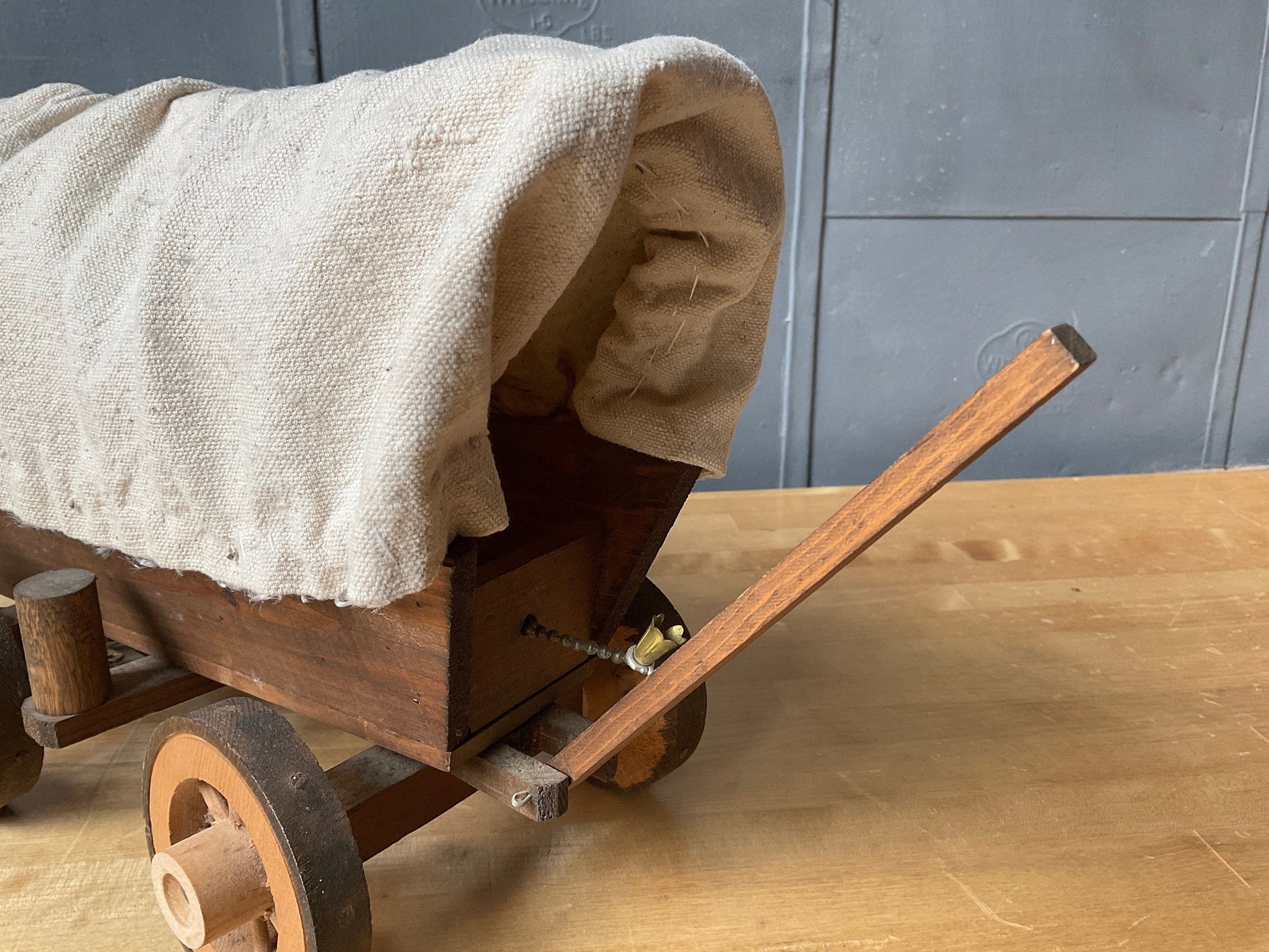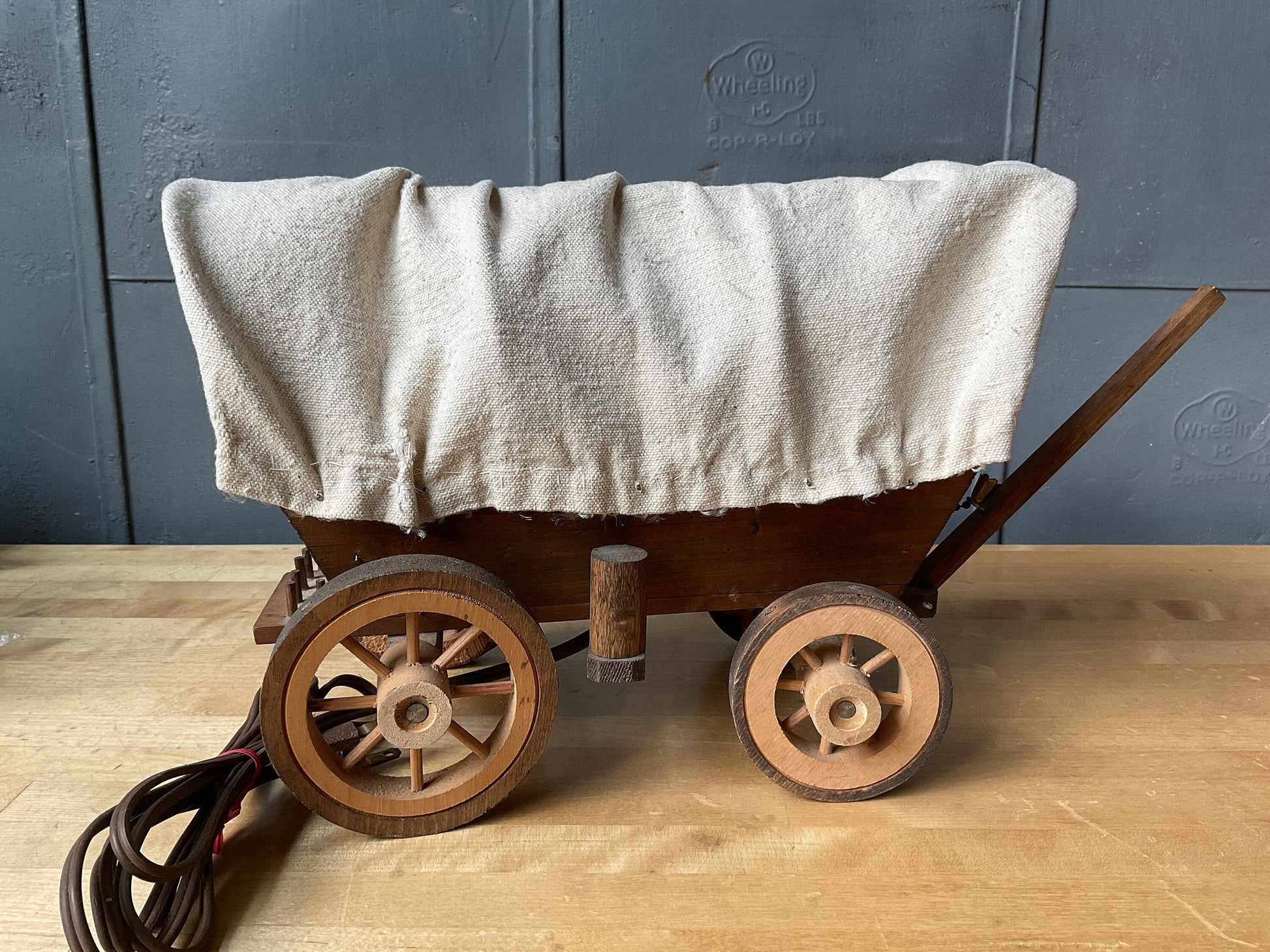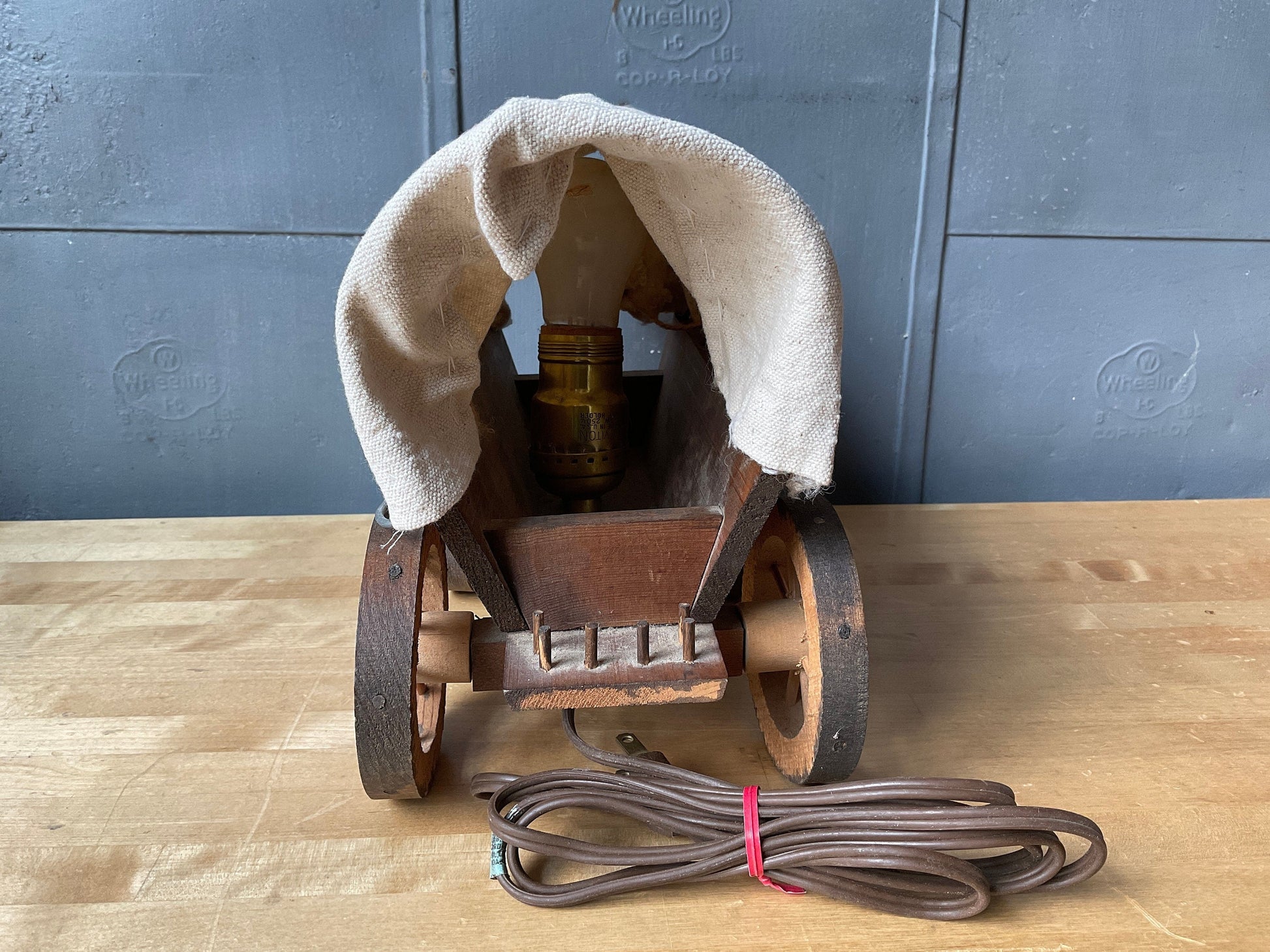 This vintage covered wagon lamp will fit right into your collection of Western Americana. The lightbulb is activated by pushing down on the wagon tongue. The cover, or "bonnet," has been replaced, but the remainder of the original parts are in great condition.